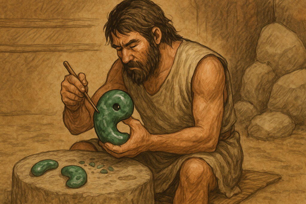 翡翠の硬度はモース硬度6.5〜7に達し、鉄器時代以前の工具では通常の加工は極めて困難です。