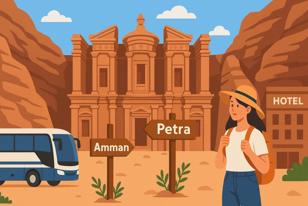 ペトラはヨルダン南部のワディ・ムーサという町に位置し、アンマンやアカバからのアクセスが便利です。
