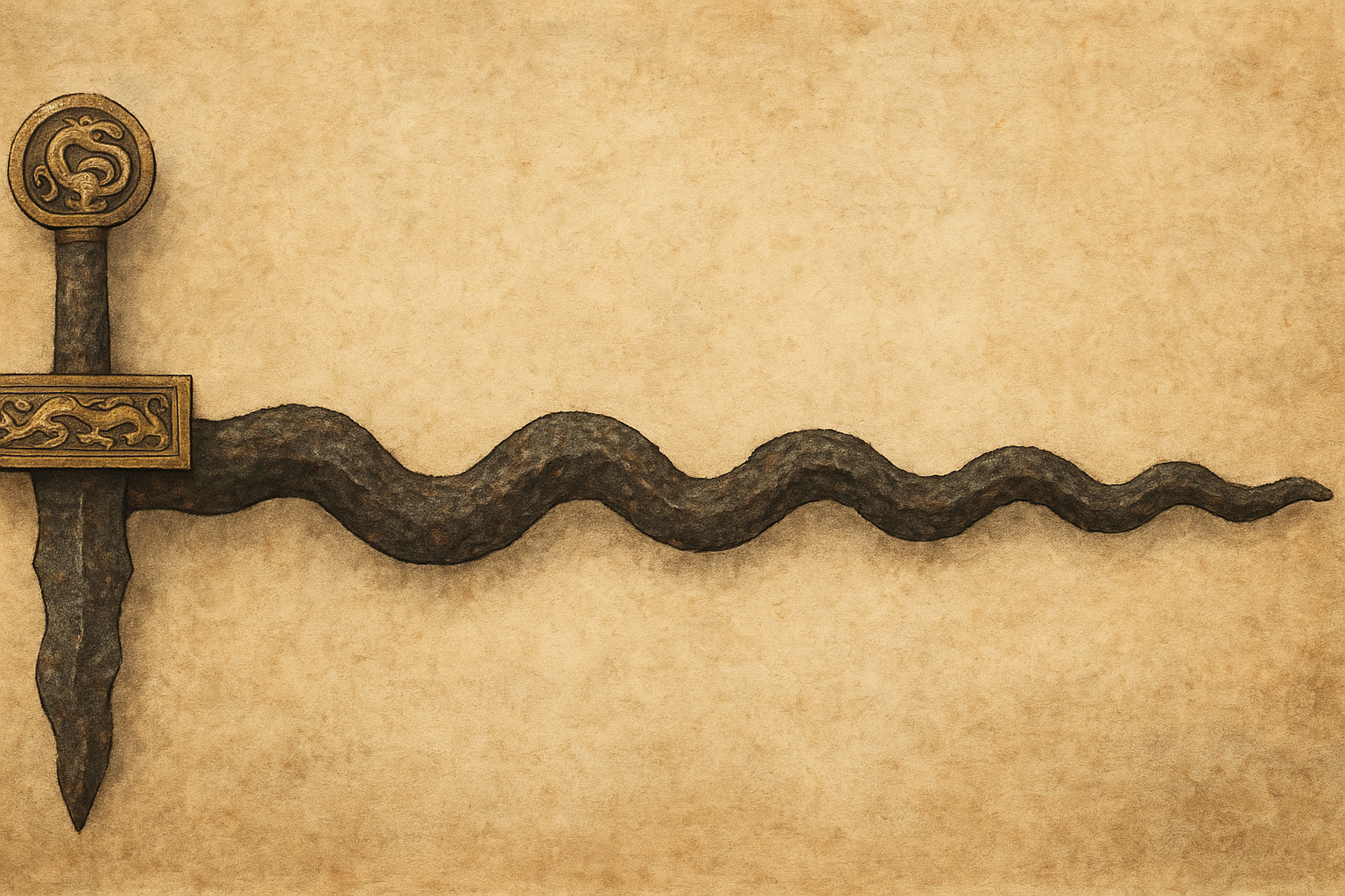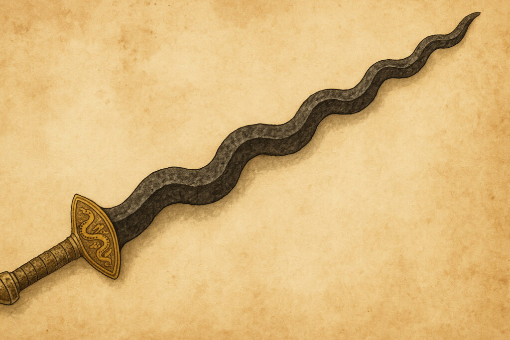 剣のうねりは単なる装飾ではなく、光の反射を強調し、儀式の場で幻想的な効果を生み出すための意図的な設計だと考えられます。