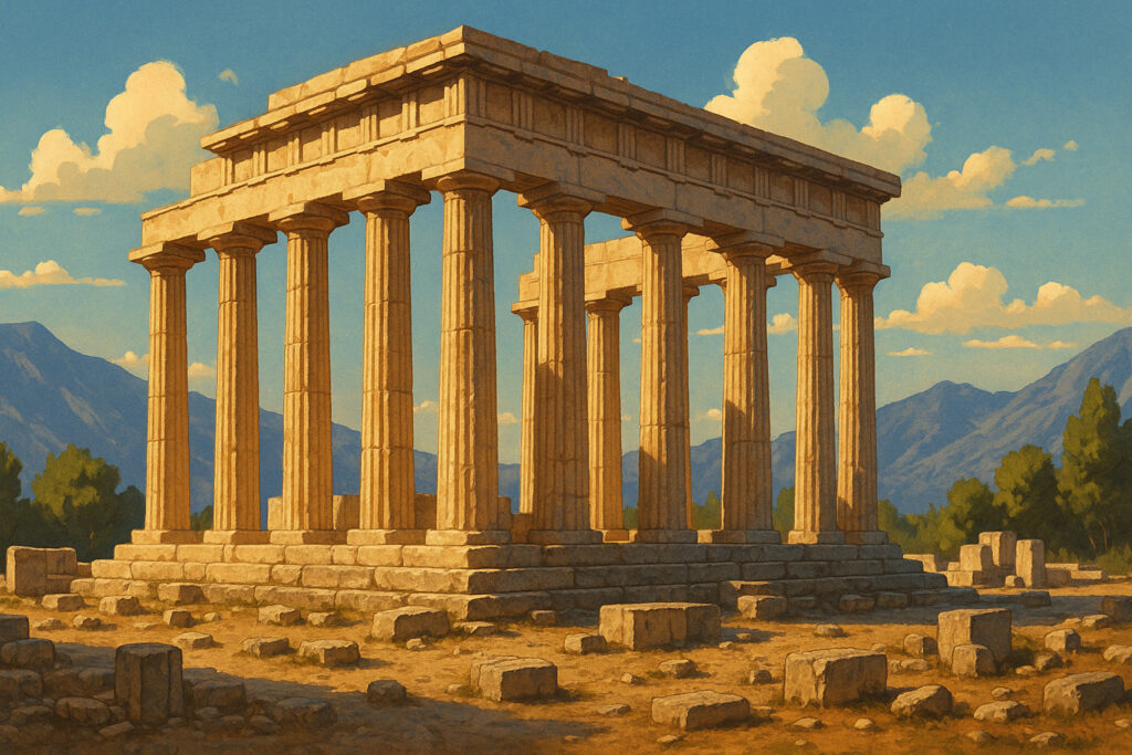 その建築様式はドーリス式を基本とし、白い大理石が太陽光を反射して黄金色に輝いたと伝えられています。