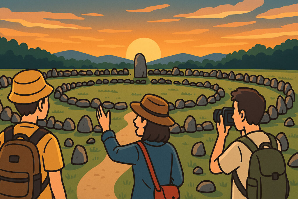 夕暮れ時、太陽がゆっくりと地平線へ沈む瞬間、石列の間を貫く光のラインはまるで太古のメッセージのように静かに輝き、訪れた人の心を強く揺さぶります。