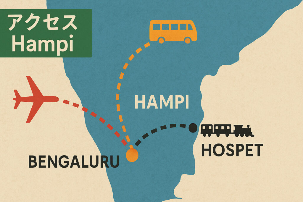 最寄りの主要都市ホスペットからハンピまでは車で約30分とアクセスが良く、バスやタクシー、オートリキシャーなど複数の交通手段が利用できます。