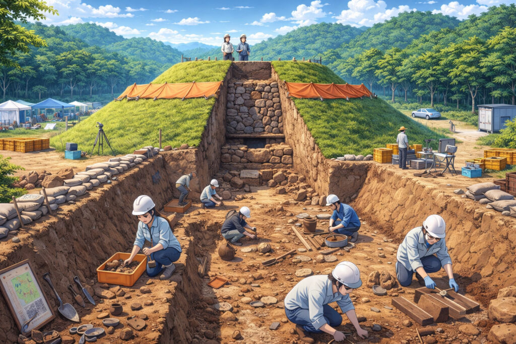 初期段階では地表に残された地形や遺物の分布を確認する表面調査が行われ、その後、試掘調査によって古墳の範囲や性格が段階的に把握されていきました。