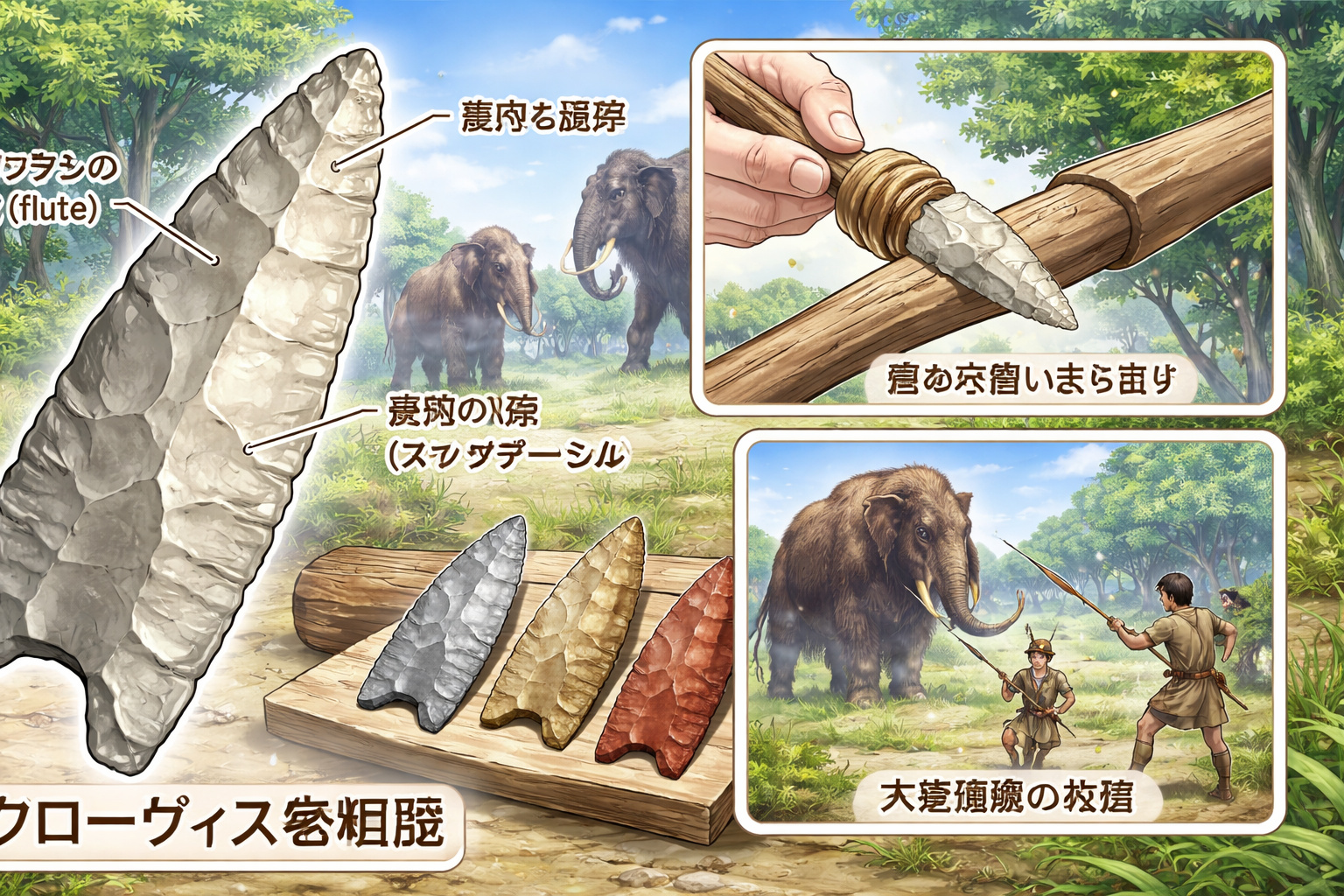 クローヴィス尖頭器の形状的な特徴や基本的な用途、他の尖頭器との分かりやすい違いを軸にしながら、当時の人々の暮らしや歴史的背景を整理し、全体像がつかめるよう丁寧に紹介していきます。