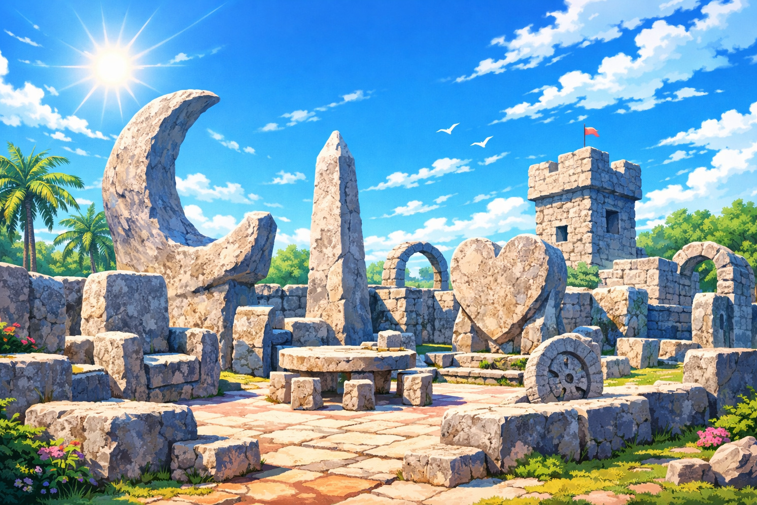 見どころとして挙げられるのは、巨大な回転門、星や月を模した彫刻群、そして石で作られたテーブルやベンチです。