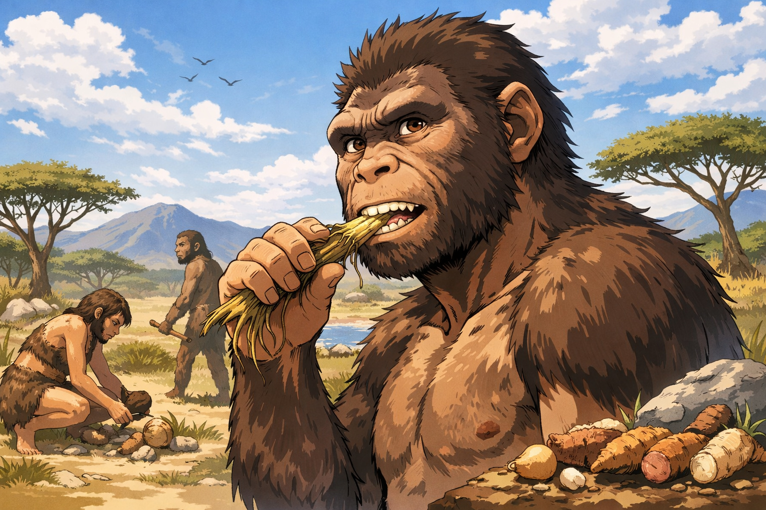 一方、ホモ属は雑食性を強め、石器を活用することで動物性タンパク質や多様な食物資源を取り入れていたと考えられている。